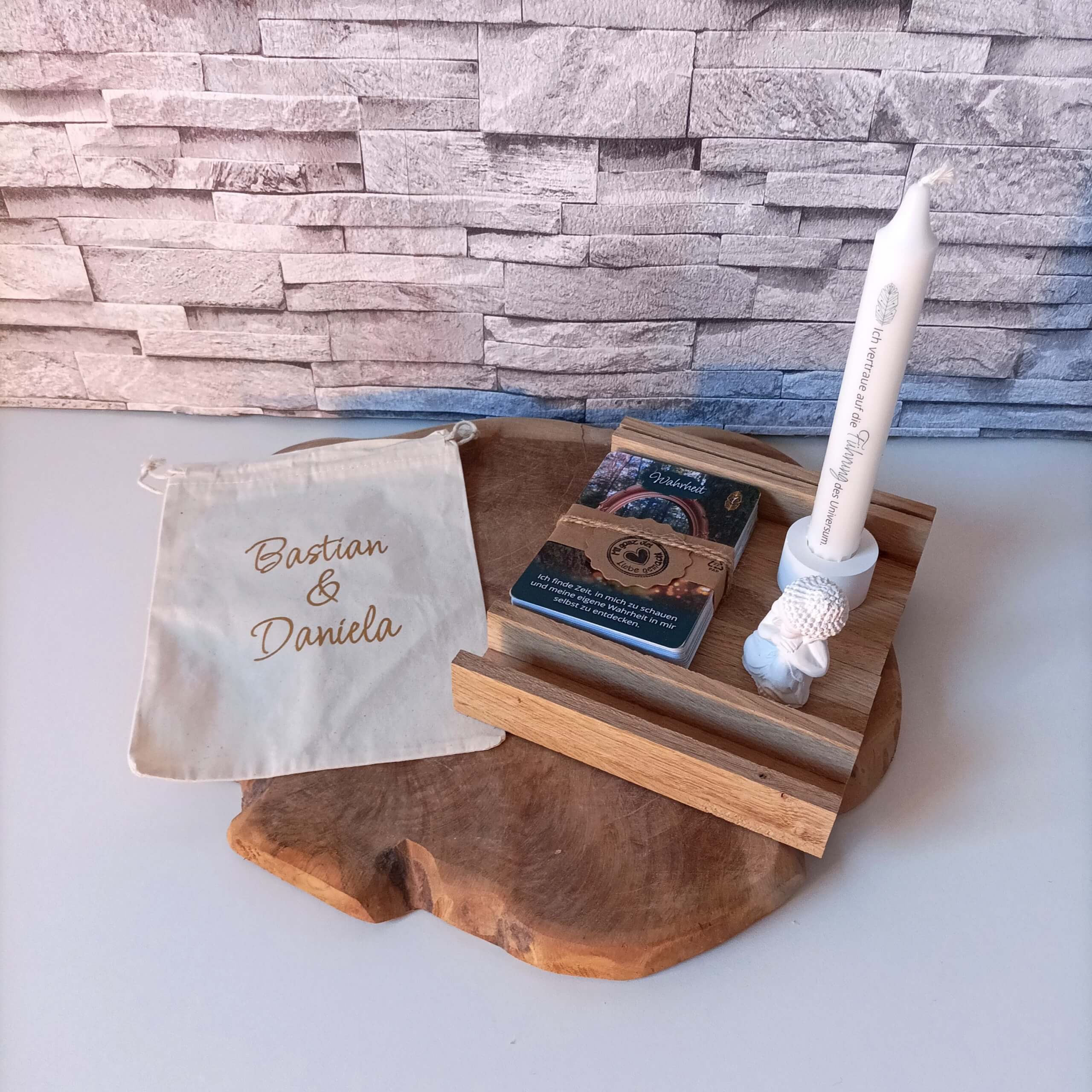 Jedes Detail dieses Achtsamkeit Geschenks wurde mit viel Hingabe gestaltet. Der Kartenhalter aus Holz wird von Hand gefertigt, die Resin-Elemente individuell gegossen und die Kerzen sorgfältig mit Affirmationen bedruckt. Der Baumwollbeutel kann zudem individuell beplottet werden – so wird jedes Set zu einem Unikat.