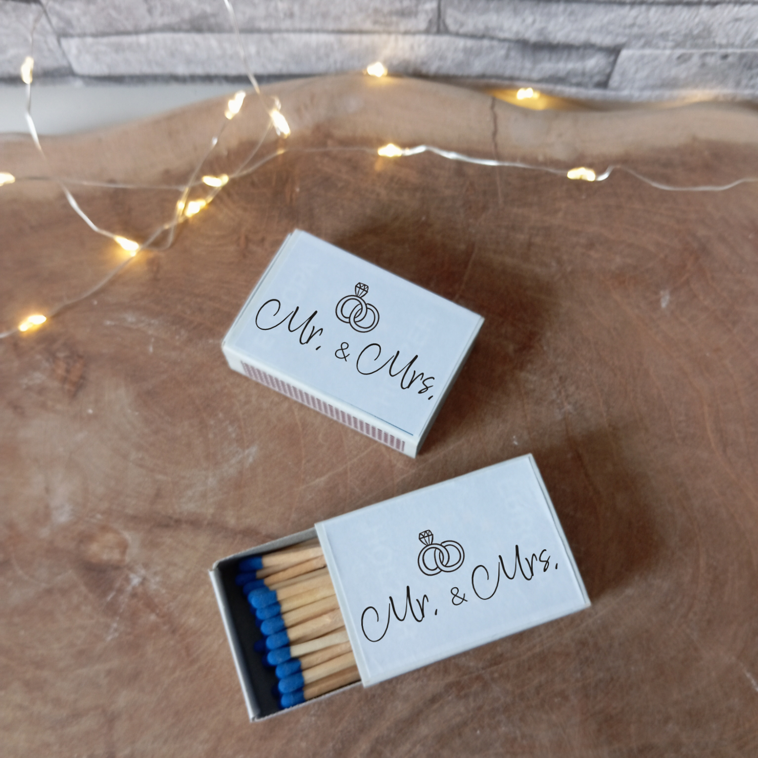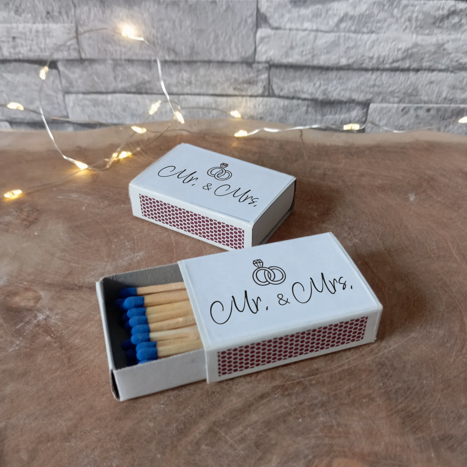 Mit den Etiketten Hochzeit – Mr. & Mrs. entsteht aus einer einfachen Streichholzschachtel ein symbolisches Element, das für Zusammenhalt, Ehe und den Beginn eines neuen Kapitels steht. Unaufgeregt, stilvoll und durchdacht – für Hochzeiten, bei denen jedes Detail zählt.