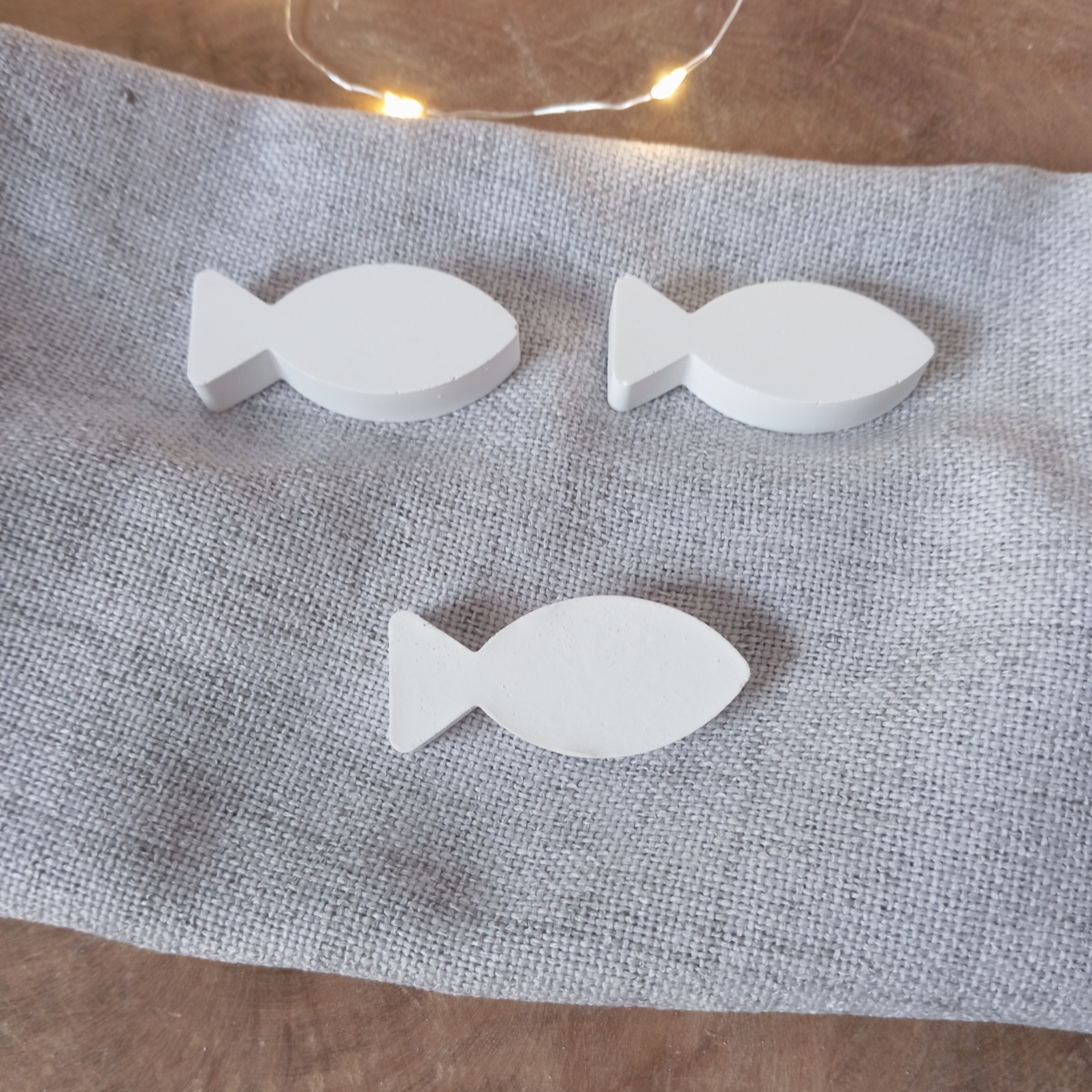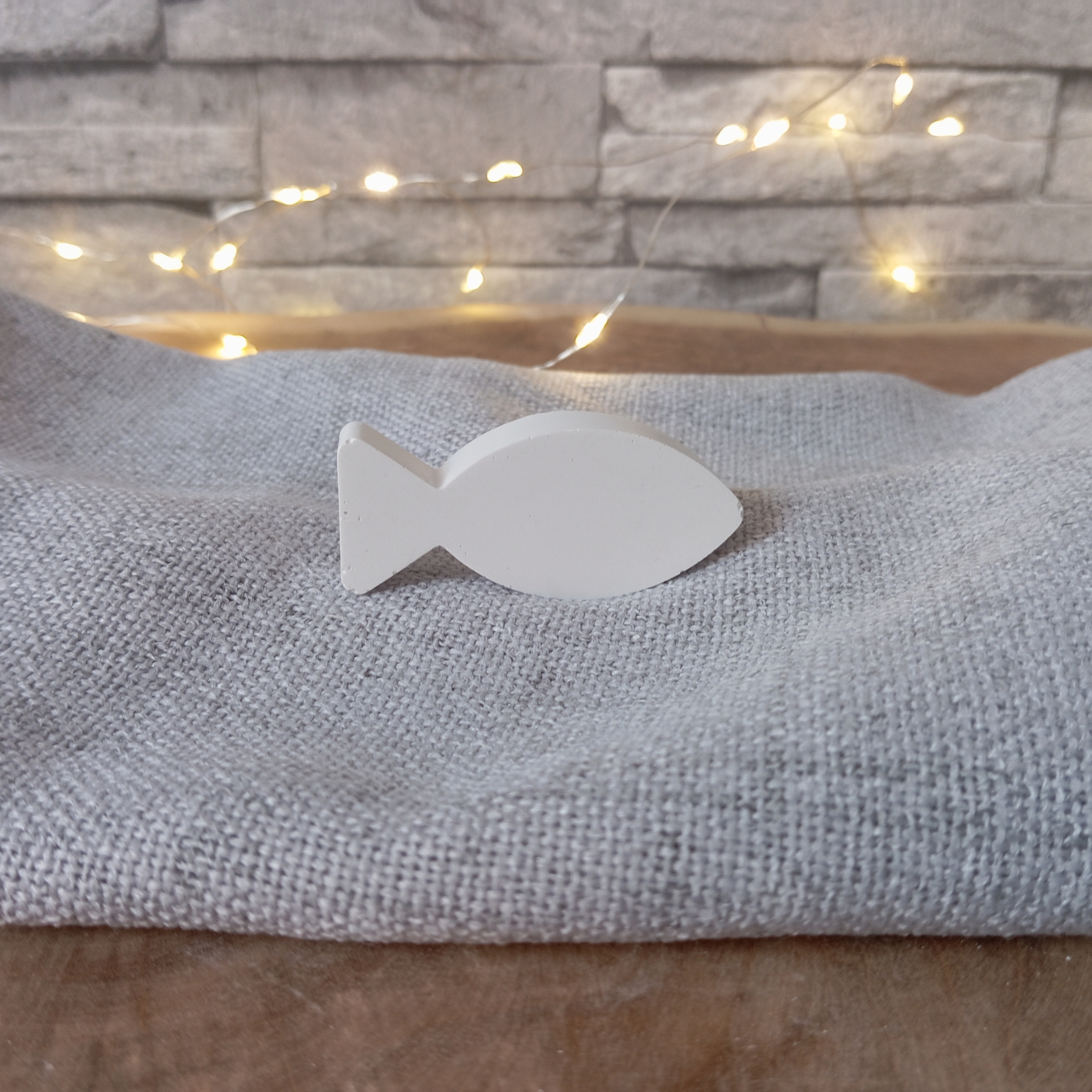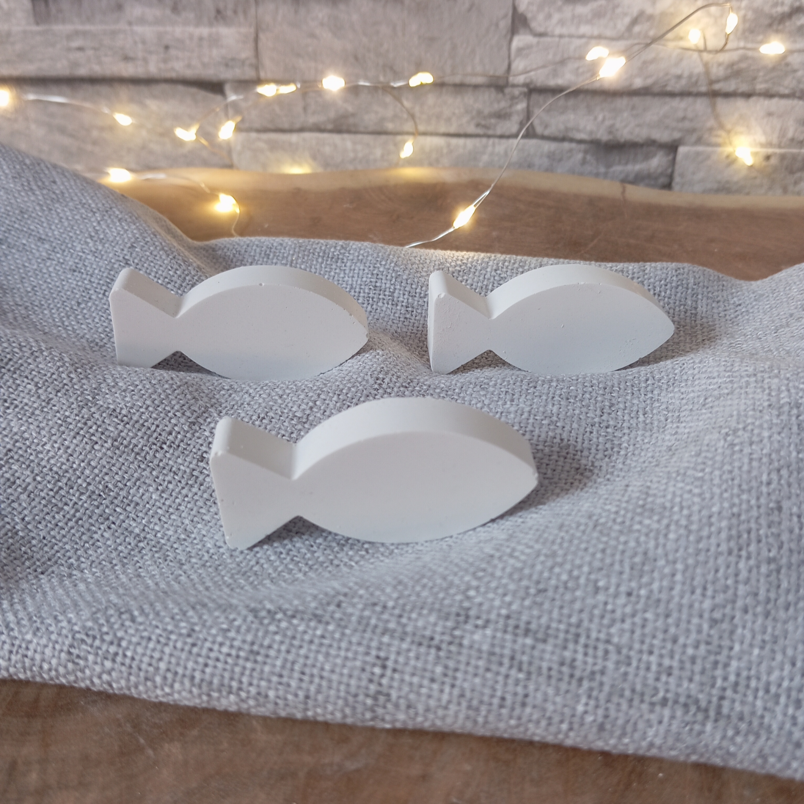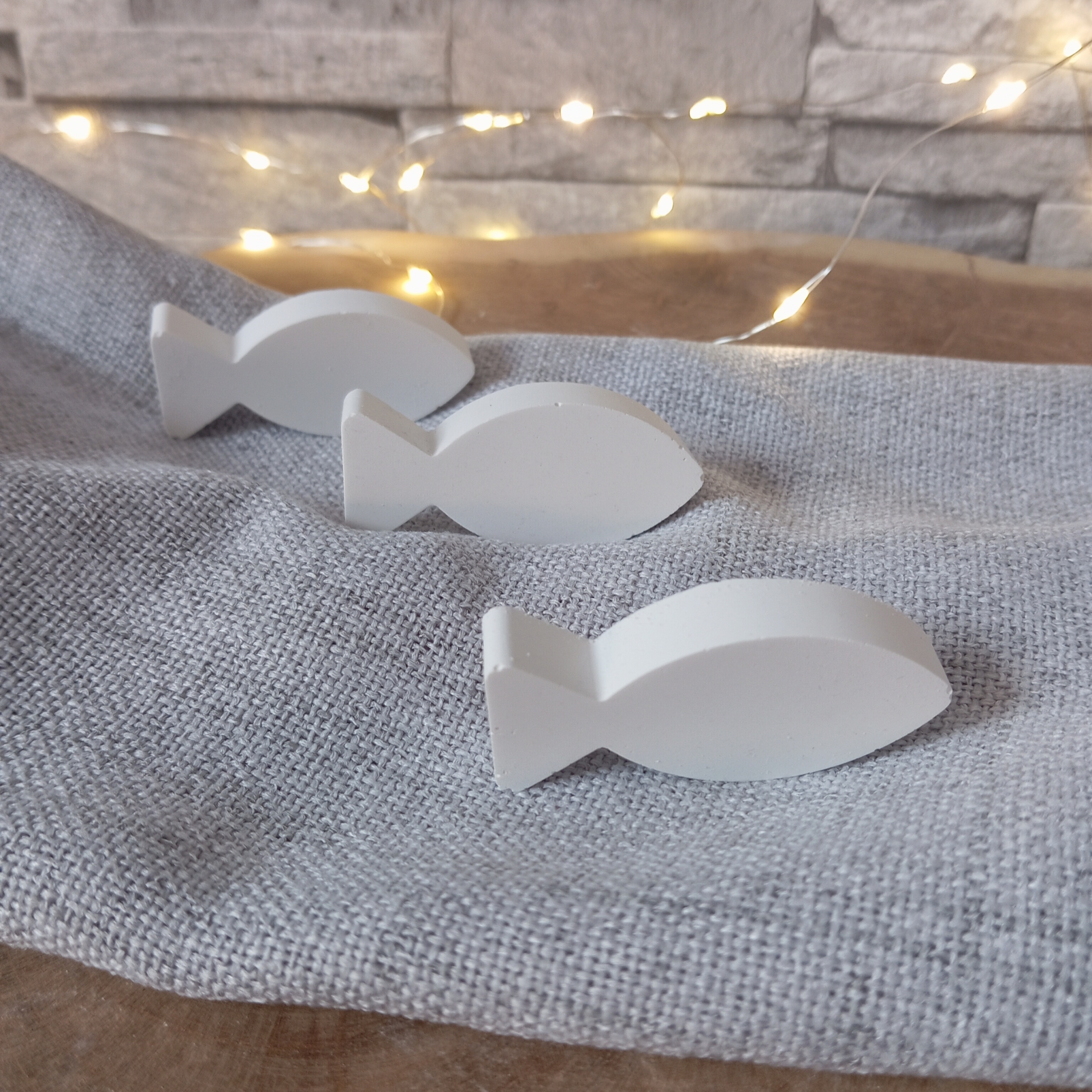 Raysin oder Keraflott, das feine, weiße Gießpulver auf Gipsbasis, verleiht den Fischen ihre charakteristische Schönheit. Leichte Unregelmäßigkeiten und Lufteinschlüsse sind Teil des einzigartigen Charmes von Raysin-Dekorationen. Jeder Fisch ist ein handgefertigtes Kunstwerk und kann leicht von den Produktfotos abweichen, was seine Individualität unterstreicht.