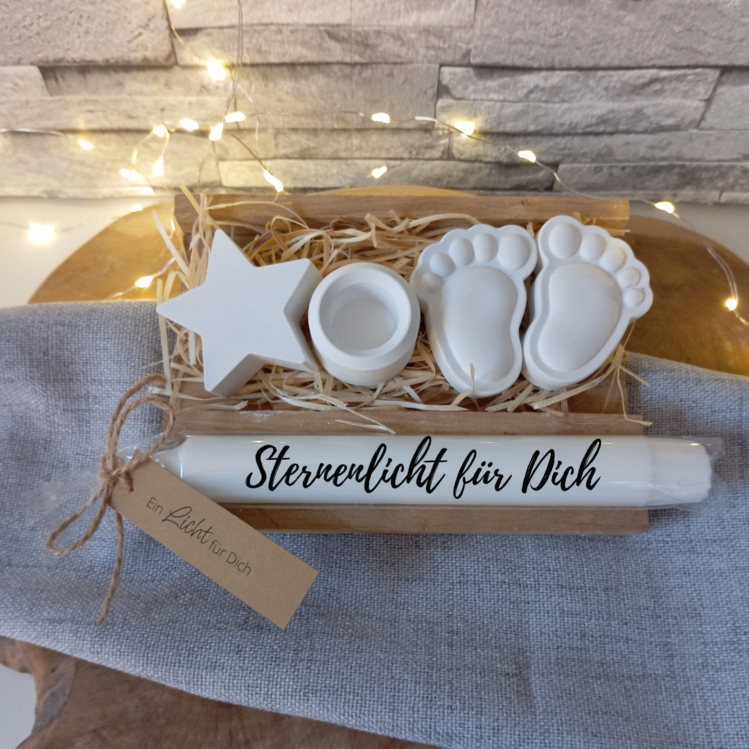 Die Geschenkbox enthält eine Kerze mit dem einfühlsamen Spruch „Sternenlicht für Dich“, der in schweren Zeiten Licht in die Dunkelheit bringt. Ein Kerzenhalter, ein Stern und zwei Babyfüßchen aus Raysin vervollständigen dieses liebevolle Ensemble. Jedes Element wurde mit Hingabe gefertigt, um nicht nur visuell, sondern vor allem emotional zu berühren.