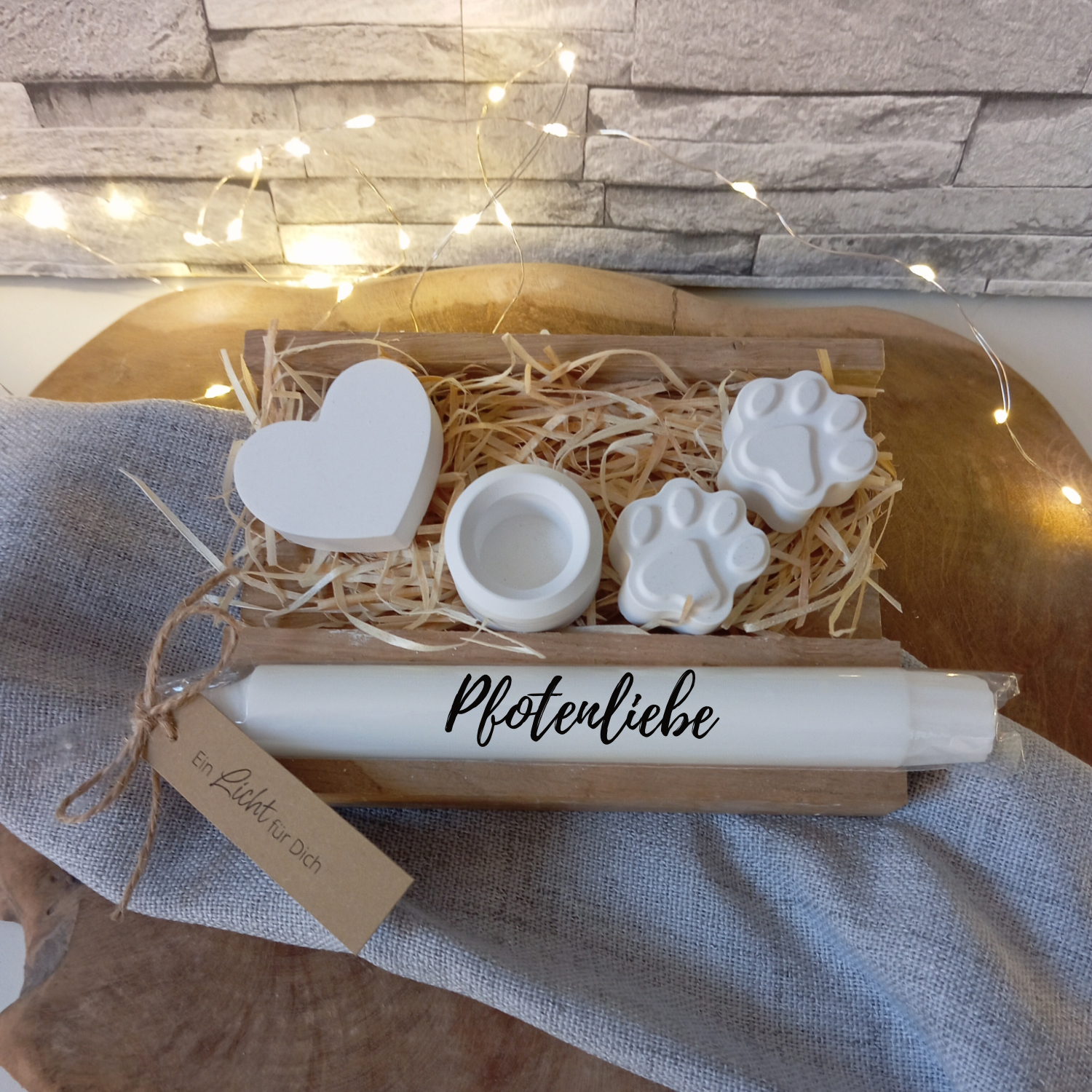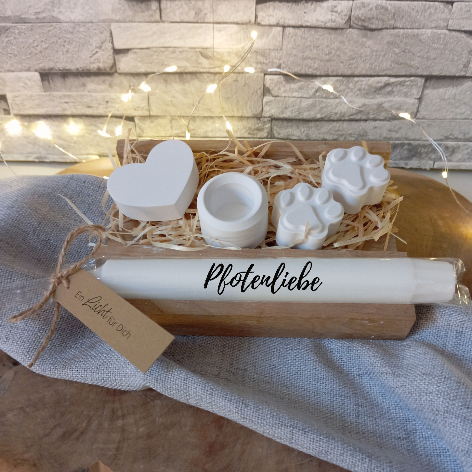 In meinem Set findest du ausgewählte, harmonisch aufeinander abgestimmte Dekoelemente, die eine ruhige und persönliche Atmosphäre schaffen. Sanftes Kerzenlicht und schlichte Formen unterstützen dabei, Tierliebhabern eine Freude zu schenken oder Erinnerungen an ein geliebtes Haustier achtsam zu bewahren.