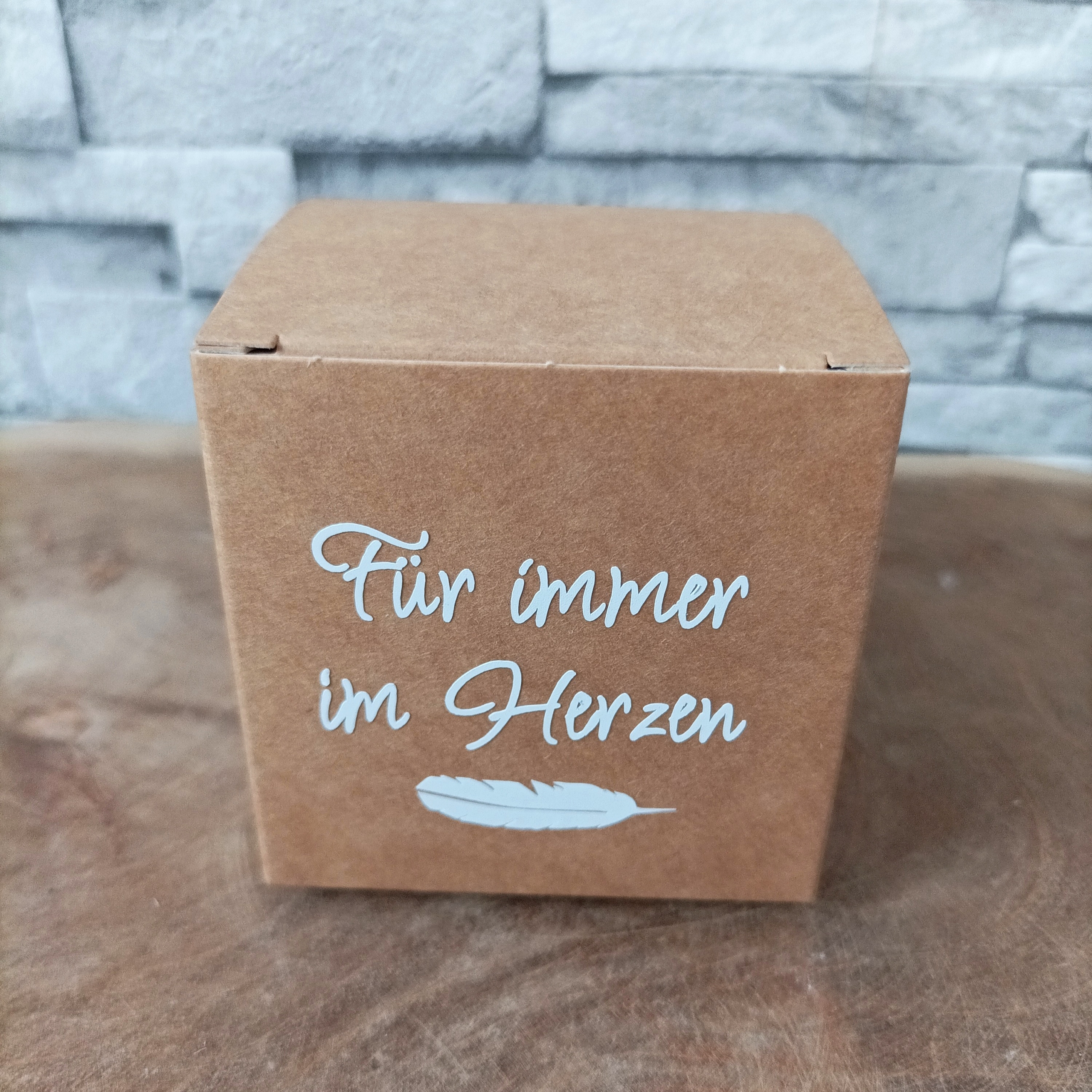 Meine Weihnachtskugeln Trauer werden sicher in der Standard Box verpackt. Für eine besondere Erinnerung biete ich die ANDENKEN-Box an, die gegen einen kleinen Aufpreis mit dem Schriftzug „Für immer im Herzen“ auf der Vorderseite bedruckt wird. Die Kugel wird sicher in Holzwolle verpackt und mit einem besonderen Kugelanhänger geliefert. So wird die Verpackung selbst zu einem Erinnerungsstück und das Geschenk ist direkt bereit, einem lieben Menschen ein wenig Trost zu spenden.