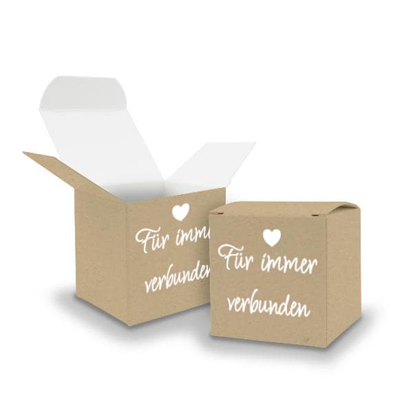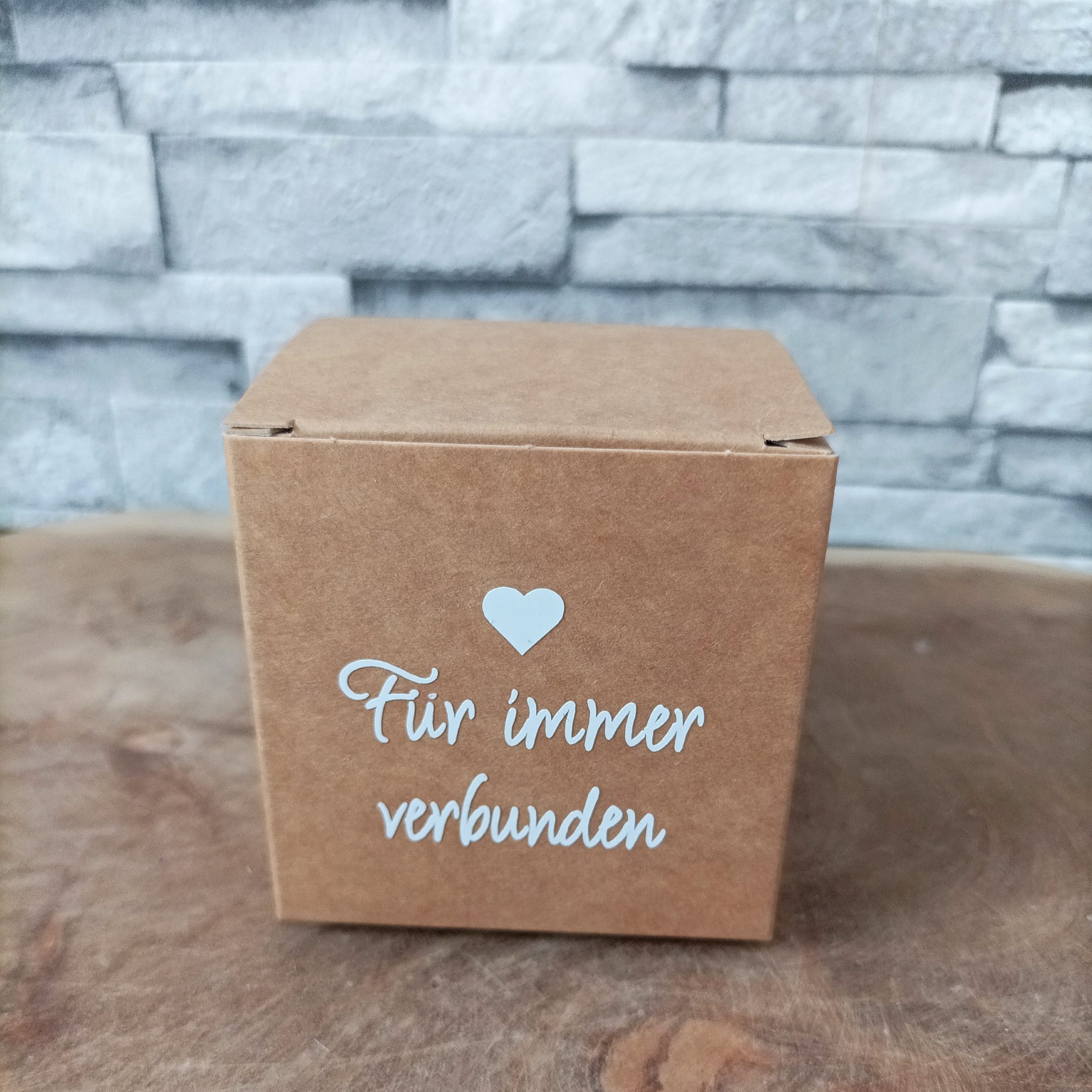 Meine personalisierten Weihnachtskugeln für Liebe, Hochzeit und besondere Herzensmomente werden sicher in der Standard Box verpackt. Für einen liebevollen Akzent biete ich die LOVE Box an, die gegen einen kleinen Aufpreis mit dem Schriftzug „Für immer verbunden“ auf der Vorderseite bedruckt wird. Die Kugel wird sicher in Holzwolle verpackt und mit einem besonderen Kugelanhänger geliefert. So wird die Verpackung selbst zu einem Teil des Geschenks und unterstreicht die Bedeutung dieses besonderen Moments.